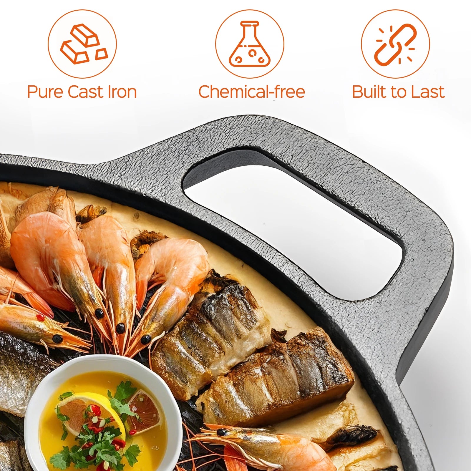 - Pre-seasoned for immediate use with a natural finish and no chemical coatings, so you can start searing and sautéing in your cast iron skillet from day one.