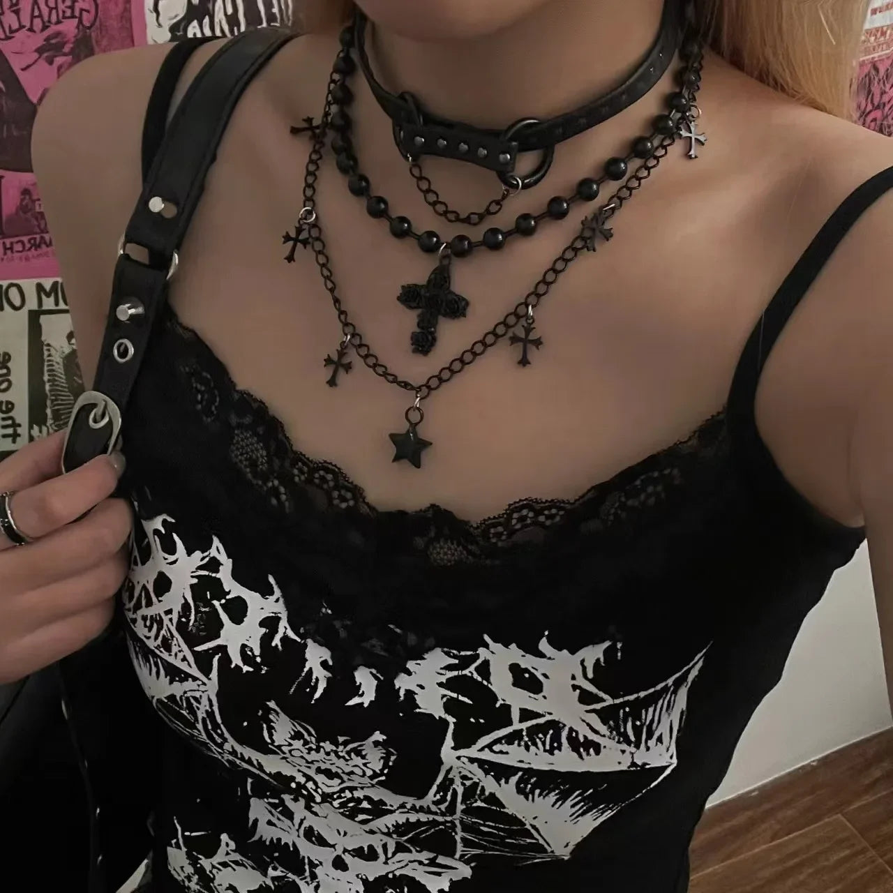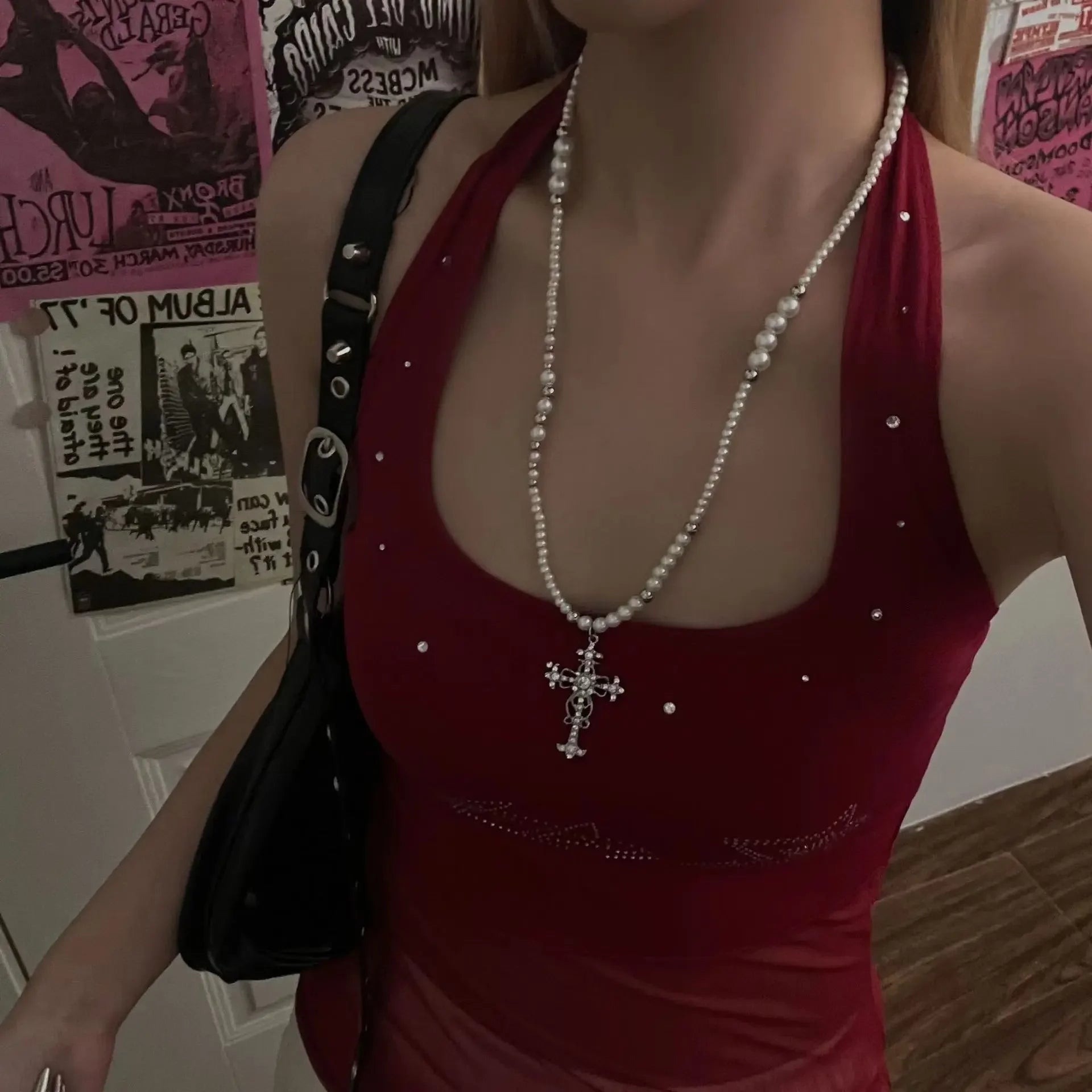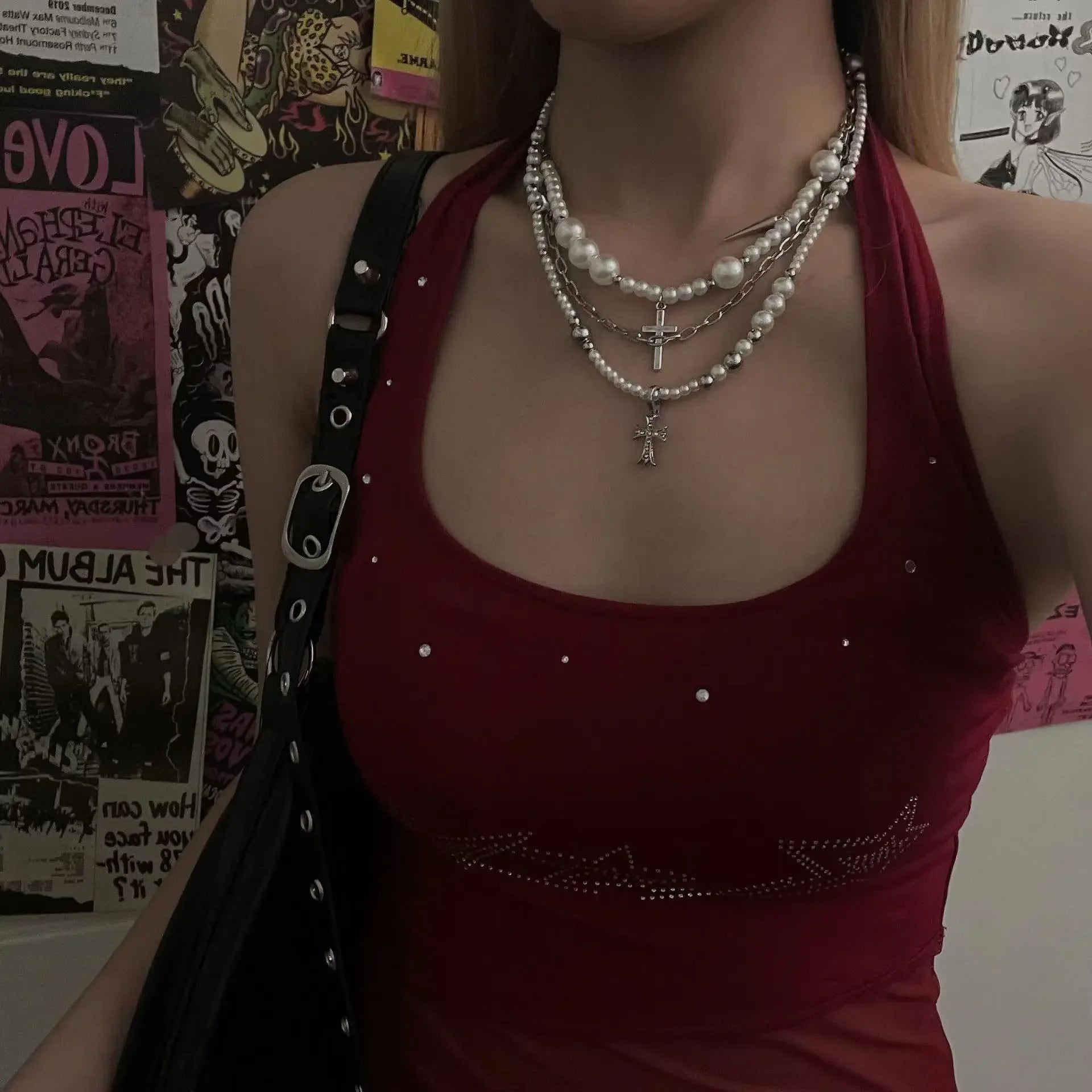 Turn heads with a bold multilayer cross pendant necklace that blends punk edge with pearl-soft sparkle for every occasion.