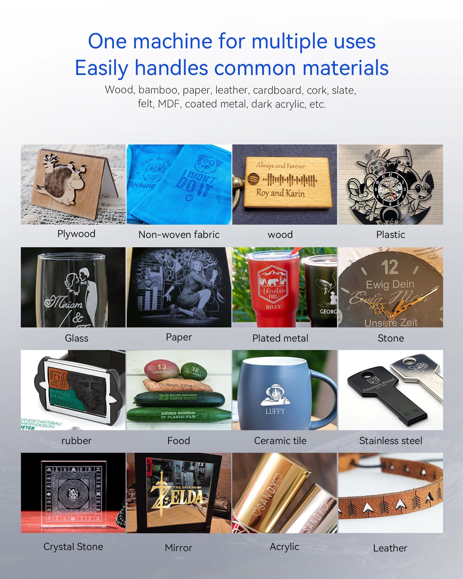 - Connectivity and accessories: WiFi/Hotspot/USB, supports LightBurn; direct hotspot for outdoor use; expandable with rollers, chucks, camera, honeycomb panel, air pump, heightening legs, and more.
