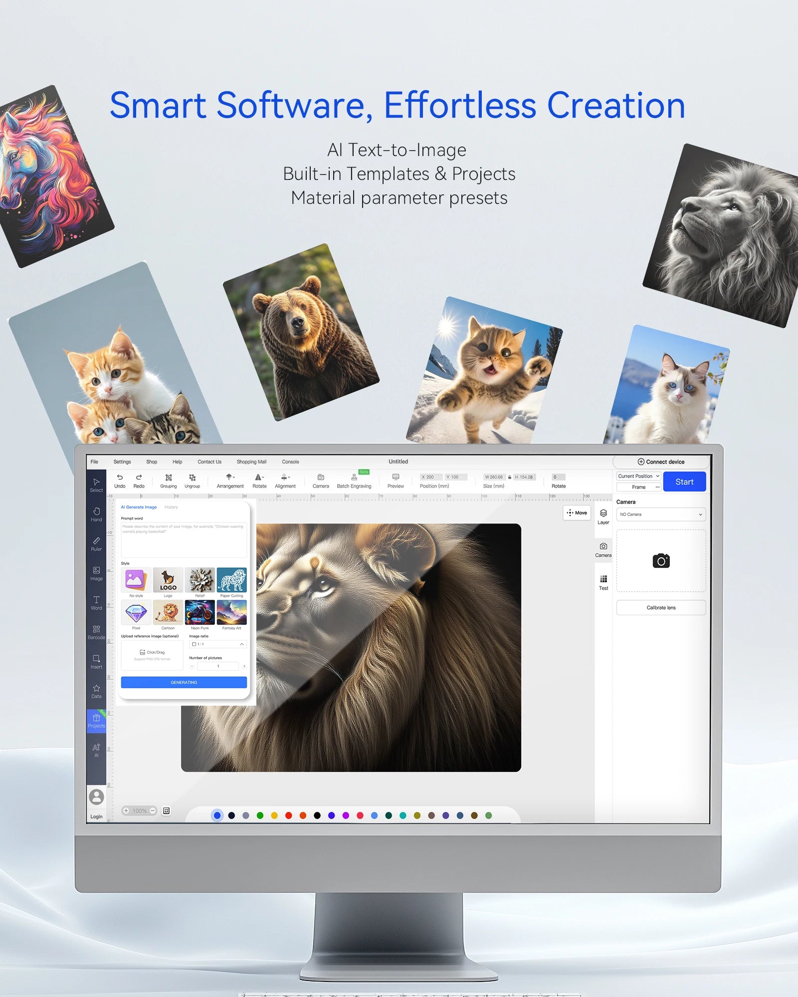 - Robust software and AI features: AtomStack and LightBurn compatibility, AI-generated images, one-click creation, preset material parameters, and intelligent accessory recognition.